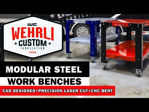 These heavy-duty steel modular work benches from WCFab are CAD Designed, Precision Laser Cut, and CNC Bent from 11 gauge steel. The interchangeable top and shelf are fully gusseted with interlocking ribbed construction and MIG Welded (TIG Welding on Stainless Steel Tops) to provide an excellent balance of strength and durability with overall weight when used as a rolling workstation utilizing the optional casters.